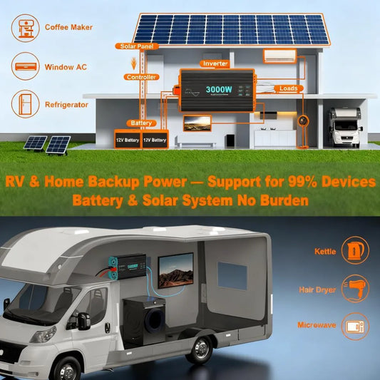 3000W Pure Sine Power Inverter, 12V DC to 120V AC, Multi-Ports & Remote for Heavy-Duty Use.
